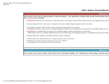 Week 3 ‐ All Days This week is for you to spend time in your territory. The specifics of what this week should look like for you is up to you and your Sales Manager. Suggestions for this week are listed below (those that • Required: Mandatory Conference call with Sales Training to review 201 Expectations and Agenda (See email/google calendar for invite) APEX Sales‐ Account Selling, APEX Sales Account Planning‐ The Selling Process, and APEX Sales Account Pl