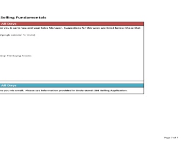 Week 3 ‐ All Days This week is for you to spend time in your territory. The specifics of what this week should look like for you is up to you and your Sales Manager. Suggestions for this week are listed below (those that • Required: Mandatory Conference call with Sales Training to review 201 Expectations and Agenda (See email/google calendar for invite) APEX Sales‐ Account Selling, APEX Sales Account Planning‐ The Selling Process, and APEX Sales Account Pl