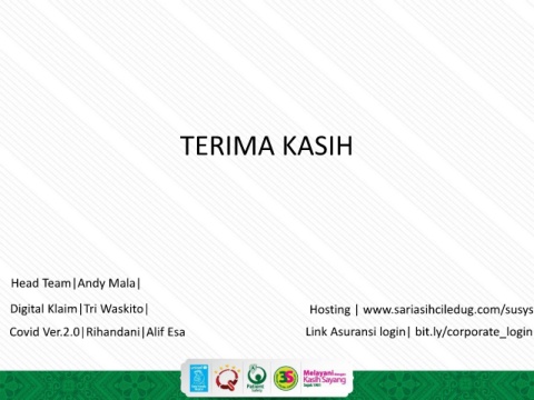 TERIMA KASIH Head Team|Andy Mala| Digital Klaim|Tri Waskito| Hosting | www.sariasihciledug.com/susys Covid Ver.2.0|Rihandani|Alif Esa Link Asuransi login| bit.ly/corporate_login