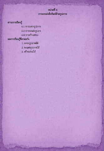 หน่วยที่ 6 กำรตกแต่งสิ่งพิมพ์ด้วยรูปภำพ สำระกำรเรียนรู้ 6.1 การแทรกรูปภาพ 6.2 การตกแต่งรูปภพ 6.4 การสร้างเฟรม ผลกำรเรียนรู้ที่คำดหวัง 1. แทรกรูปภาพได้ 2. ตกแต่งรูปภาพได้ 3. สร้างเฟรมได้