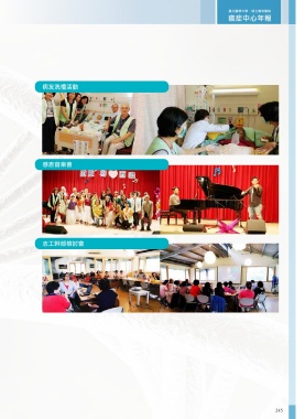 臺北醫學大學•部立雙和醫院 105年報 癌症中心年報 活動照片 門診治療病人、家屬陪談關懷、病房訪視 病友洗禮活動 心靈成長課程 - 與生命相遇 感恩音樂會 癌症新知、中醫養生食療 志工幹部檢討會 病友家屬聯誼會 244 245