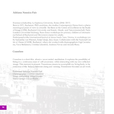 Born in 1971, Bucharest. PhD candidate, she studies Contemporary Dance from a pheno