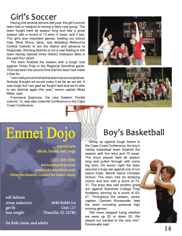 Going up against tough teams in the Cape Coast Conference, the boy’s varsity basketball team finished the season with five wins and 15 loses. The boy’s played hard all season long and pulled through with some big wins. On senior night the team secured a huge win against one of our island rivals, Merritt Island Christian School. The team had an amazing victory and won with a score of 73- 31. The boys also had another great win against Somerset College Prep Academy winning by a score of 63- 51. Throughout the season, senior captain, Camden Ronsisvalle, lead the team recording personal high scoring games.