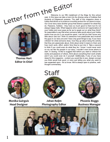 Welcome to our fifth installment of the Edge for this school year. In this issue we take a look into the diverse array of hobbies that students at Edgewood possess. The staff of this magazine share a hobby that drives us to produce a monthly product for our peers to enjoy. Our cover story sees another group that shares a passion for what they do. Passions, hobbies - they have so much good to them but it’s not always happy trails. What happens when someone isn’t appreciative of your hobby and even goes as far as to speak out on what they think? Its reasonable to say that when someone talks poorly about your hobby and/or how you do it, you would be upset. I can tell you that I know very little about cars but I think it’s awesome how passionate and involved the guys in our story are and I have only good things to say. If you have criticism for what someone does, how they go about doing the activity that they are passionate about, think about what it means to them and how much work, effort, and/or time they’ve put into it. Take a second to think if you could even do what they do; I know I could never work on my car like the people in our story, I wouldn’t even know where to start. In closing, I’d like to suggest that before you start to criticize the works and passions of others, think about everything their work entails and if you could even do it yourself. Additionally, if any of you have ideas for this magazine - content you would like to see, design concept you think would look good, or even just telling you what you want to see expanded upon - let us know. We’re always open to positive, well- thought commentary.