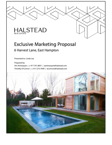 Exclusive Marketing Proposal 6 Harvest Lane, East Hampton Presented to: Linda Lea Prepared by: Ani Antreasyan | c: 917.701.8801 | aantreasyan@halstead.com Timothy O'Connor | c: 917.273.7099 | toconnor@halstead.com