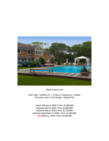 Listed: February 6, 2018 | Price: $1,999,000 Reduced: April 6, 2018 | Price: $1,895,000 Reduced: May 8, 2018 | Price: $1,795,000 Reduced: September 11, 2018 | Price: $1,695,000 Sold: March 1, 2019 | Price: $1,650,000