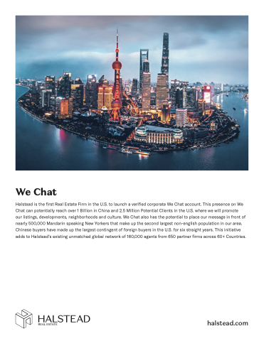 our listings, developments, neighborhoods and culture. We Chat also has the potential to place our message in front of nearly 500,000 Mandarin speaking New Yorkers that make up the second largest non-english population in our area. Chinese buyers have made up the largest contingent of foreign buyers in the U.S. for six straight years. This initiative adds to Halstead’s existing unmatched global network of 160,000 agents from 650 partner firms across 60+ Countries.