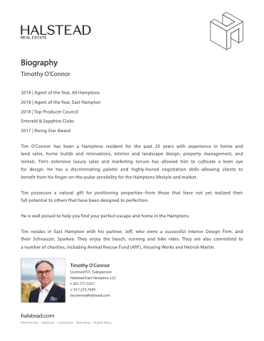 Tim O’Connor has been a Hamptons resident for the past 25 years with experience in home and land sales, home builds and renovations, interior and landscape design, property management, and rentals. Tim’s extensive luxury sales and marketing tenure has allowed him to cultivate a keen eye for design. He has a discriminating palette and highly-honed negotiation skills--allowing clients to benefit from his finger-on-the-pulse sensibility for the Hamptons lifestyle and market.