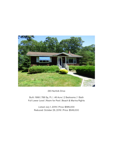 293 Norfolk Drive Built: 1966 | 768 Sq. Ft. | .46 Acre | 2 Bedrooms | 1 Bath Full Lower Level | Room for Pool | Beach & Marina Rights Listed: July 1, 2019 | Price: $595,000 Reduced: October 29, 2019 | Price: $549,000