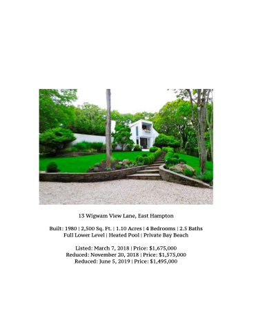 Listed: March 7, 2018 | Price: $1,675,000 Reduced: November 20, 2018 | Price: $1,575,000 Reduced: June 5, 2019 | Price: $1,495,000