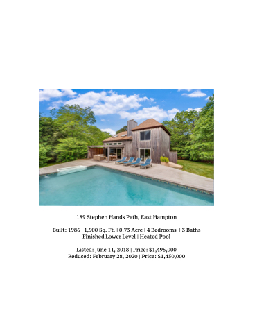 189 Stephen Hands Path, East Hampton Built: 1986 | 1,900 Sq. Ft. | 0.73 Acre | 4 Bedrooms | 3 Baths Finished Lower Level | Heated Pool Listed: June 11, 2018 | Price: $1,495,000 Reduced: February 28, 2020 | Price: $1,450,000
