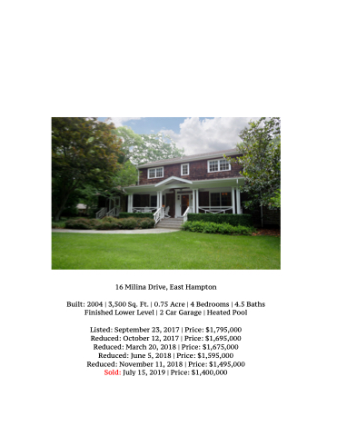 Listed: September 23, 2017 | Price: $1,795,000 Reduced: October 12, 2017 | Price: $1,695,000 Reduced: March 20, 2018 | Price: $1,675,000 Reduced: June 5, 2018 | Price: $1,595,000 Reduced: November 11, 2018 | Price: $1,495,000 Sold: July 15, 2019 | Price: $1,400,000