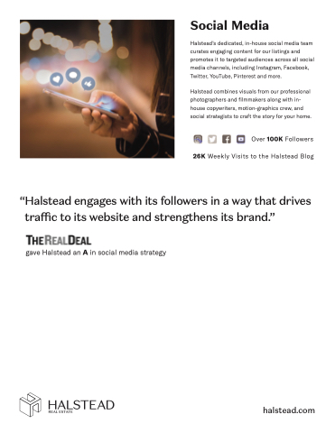Halstead’s dedicated, in-house social media team curates engaging content for our listings and promotes it to targeted audiences across all social media channels, including Instagram, Facebook, Twitter, YouTube, Pinterest and more.