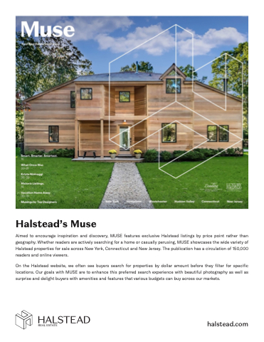Aimed to encourage inspiration and discovery, MUSE features exclusive Halstead listings by price point rather than geography. Whether readers are actively searching for a home or casually perusing, MUSE showcases the wide variety of Halstead properties for sale across New York, Connecticut and New Jersey. The publication has a circulation of 150,000 readers and online viewers.