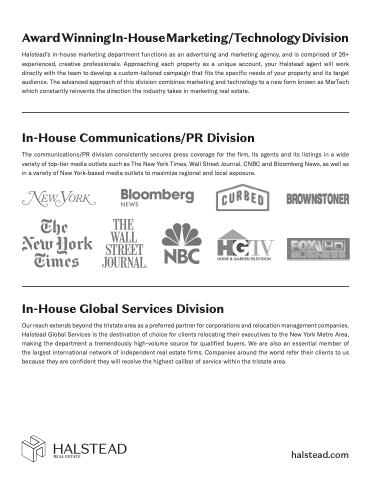 Halstead’s in-house marketing department functions as an advertising and marketing agency, and is comprised of 26+ experienced, creative professionals. Approaching each property as a unique account, your Halstead agent will work directly with the team to develop a custom-tailored campaign that fits the specific needs of your property and its target audience. The advanced approach of this division combines marketing and technology to a new form known as MarTech which constantly reinvents the direction the industry takes in marketing real estate.