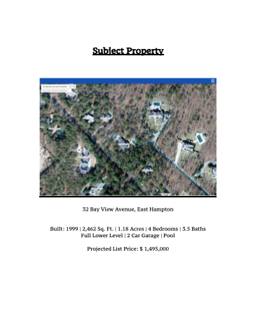 Subject Property 32 Bay View Avenue, East Hampton Built: 1999 | 2,462 Sq. Ft. | 1.18 Acres | 4 Bedrooms | 3.5 Baths Full Lower Level | 2 Car Garage | Pool Projected List Price: $ 1,495,000