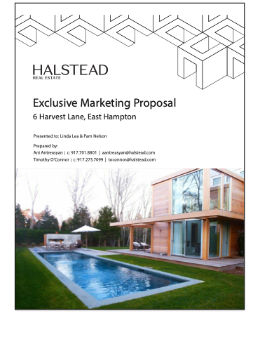 Exclusive Marketing Proposal 6 Harvest Lane, East Hampton Presented to: Linda Lea & Pam Nelson Prepared by: Ani Antreasyan | c: 917.701.8801 | aantreasyan@halstead.com Timothy O'Connor | c: 917.273.7099 | toconnor@halstead.com