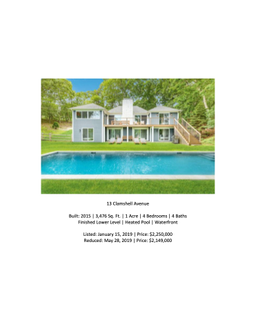 13 Clamshell Avenue Built: 2015 | 3,476 Sq. Ft. | 1 Acre | 4 Bedrooms | 4 Baths Finished Lower Level | Heated Pool | Waterfront Listed: January 15, 2019 | Price: $2,250,000 Reduced: May 28, 2019 | Price: $2,149,000