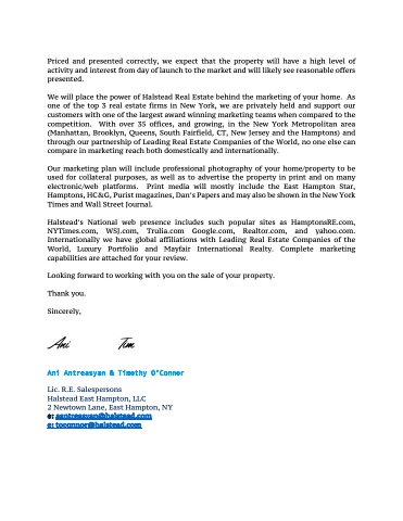 Halstead’s National web presence includes such popular sites as HamptonsRE.com, NYTimes.com, WSJ.com, Trulia.com Google.com, Realtor.com, and yahoo.com. Internationally we have global affiliations with Leading Real Estate Companies of the World, Luxury Portfolio and Mayfair International Realty. Complete marketing capabilities are attached for your review.