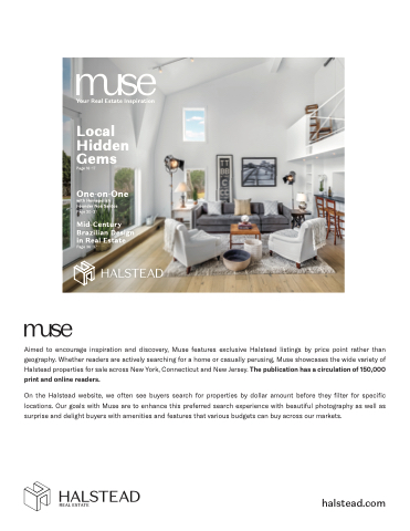 Aimed to encourage inspiration and discovery, Muse features exclusive Halstead listings by price point rather than geography. Whether readers are actively searching for a home or casually perusing, Muse showcases the wide variety of Halstead properties for sale across New York, Connecticut and New Jersey. The publication has a circulation of 150,000 print and online readers.