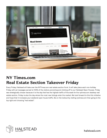 Every Friday, Halstead will take over the NYTimes.com real estate section front. It will take place each non-holiday Friday with ad messages served to 100% of the visitors promoting and clicking off to our Halstead Open Houses. Friday was strategically chosen because it is the day that has the highest traffic of the week for the nytimes.com desktop real estate section. Friday is also the day where the most new listings enter the market. We look forward to this this initiative and hope that it increases your weekend open house traffic. Be on the lookout by visiting nytimes.com then going to the top right and choosing “real estate”.