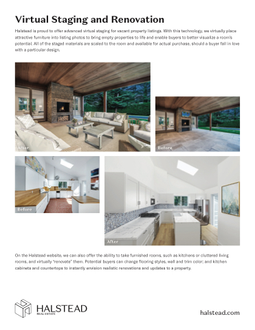 Halstead is proud to offer advanced virtual staging for vacant property listings. With this technology, we virtually place attractive furniture into listing photos to bring empty properties to life and enable buyers to better visualize a room’s potential. All of the staged materials are scaled to the room and available for actual purchase, should a buyer fall in love with a particular design.