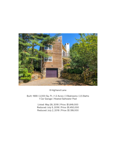 8 Highland Lane Built: 1999 | 2,000 Sq. Ft. | 1.2 Acres | 3 Bedrooms | 2.5 Baths 1 Car Garage | Heated Saltwater Pool Listed: May 28, 2018 | Price: $1,649,000 Reduced: July 5, 2018 | Price: $1,450,000 Reduced: July 2, 2019 | Price: $1,199,000