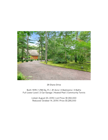 29 Diane Drive Built: 1978 | 1,786 Sq. Ft. | .81 Acre | 4 Bedrooms | 3 Baths Full Lower Level | 2 Car Garage | Heated Pool | Community Tennis Listed: August 20, 2019 | List Price: $1,350,000 Reduced: October 14, 2019 | Price: $1,295,000
