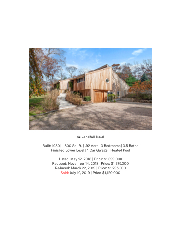 Listed: May 22, 2018 | Price: $1,399,000 Reduced: November 14, 2018 | Price: $1,375,000 Reduced: March 22, 2019 | Price: $1,295,000 Sold: July 10, 2019 | Price: $1,120,000