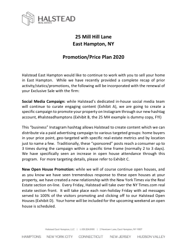 Social Media Campaign: while Halstead’s dedicated in-house social media team will continue to curate engaging content (Exhibit A), we are going to create a specific campaign to promote your property on Instagram through our new hashtag account, #halsteadhamptons (Exhibit B, the 25 MH example is dummy copy, FYI)