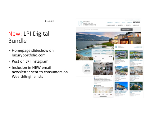 Exhibit J New: LPI Digital Bundle • Homepage slideshow on luxuryportfolio.com • Post on LPI Instagram • Inclusion in NEW email newsletter sent to consumers on WealthEngine lists