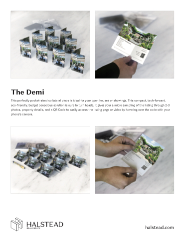This perfectly pocket-sized collateral piece is ideal for your open houses or showings. This compact, tech-forward, eco-friendly, budget conscious solution is sure to turn heads. It gives your a micro sampling of the listing through 2-3 photos, property details, and a QR Code to easily access the listing page or video by hovering over the code with your phone's camera.