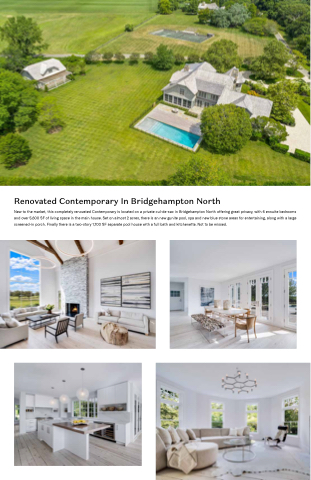 New to the market, this completely renovated Contemporary is located on a private cul-de-sac in Bridgehampton North offering great privacy, with 6 ensuite bedrooms and over 5,600 SF of living space in the main house. Set on almost 2 acres, there is an new gunite pool, spa and new blue stone areas for entertaining, along with a large screened-in porch. Finally there is a two-story 1,700 SF separate pool house with a full bath and kitchenette. Not to be missed.