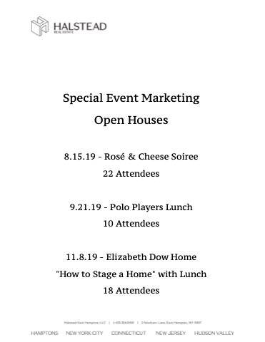 Special Event Marketing Open Houses 8.15.19 - Rosé & Cheese Soiree 22 Attendees 9.21.19 - Polo Players Lunch 10 Attendees 11.8.19 - Elizabeth Dow Home "How to Stage a Home" with Lunch 18 Attendees