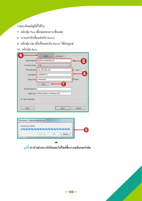 รายลดเอียาบัญชีที่ไา้รับ 7. มลิกปุกม Test เพื่อทาสอบการเชื่อมตกอ 8. รดบบก าลังเชื่อมตกอกับ Server 9. มลิกปุกม OK เมื่อเชื่อมตกอกับ Server ไา้สมบูรม์ 10. มลิกปุกม Save รูปที่ 15 ตัวอย่างการอัพโหลดเว็บไซต์ขึ้นระบบอินเทอร์เน็ต ~ 189 ~