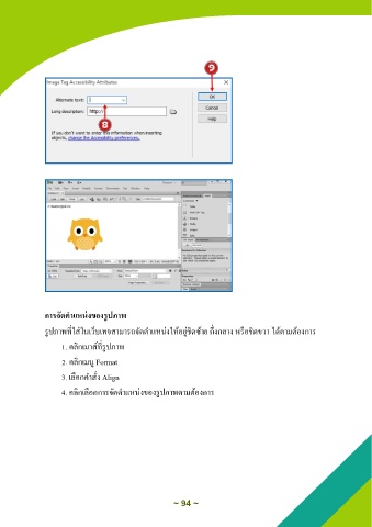 การจัดต าแหน่งของรูปภาพ รูปภาพที่ใสกในเว็บเพจสามารถจัาต าแหนกงให้อยูกชิาซ้าย กึ่งกลาง หรือชิาาวา ไา้ตามต้องการ 1. มลิกเมาส์ที่รูปภาพ 2. มลิกเมนู Format 3. เลือกม าสั่ง Align 4. มลิกเลือกการจัาต าแหนกงาองรูปภาพตามต้องการ ~ 94 ~