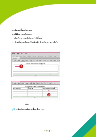 การจัดการเนื้อหาในตาราง การใส่ข้อความลงในตาราง 1. มลิกต าแหนกงเซลที่ต้องการใสกเนื้อหา 2. พิมพ์เนื้อหาแล้วกาแป้นแท็บเพื่อพิมพ์เนื้อหาในเซลถัาไป รูปที่ 4 ตัวอย่างการจัดการเนื้อหาในตาราง ~ 113 ~