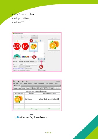 4. เลือกต าแหนกงาองรูปภาพ 5. มลิกรูปภาพที่ต้องการ 6. มลิกปุกม OK รูปที่ 6 ตัวอย่างการใส่รูปภาพลงในตาราง ~ 116 ~