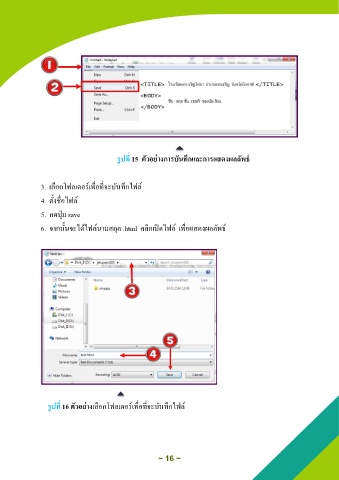 รูปที่ 15 ตัวอย่างการบันทึกและการแสดงผลลัพธ์ 3. เลือกโฟลเาอร์เพื่อที่จดบันทึกไฟล์ 4. ตั้งชื่อไฟล์ 5. กาปุกม save 6. จากนั้นจดไา้ไฟล์นามสกุล .html มลิกเปิาไฟล์ เพื่อแสางผลลัพธ์ รูปที่ 16 ตัวอย่างเลือกโฟลเาอร์เพื่อที่จดบันทึกไฟล์ ~ 16 ~