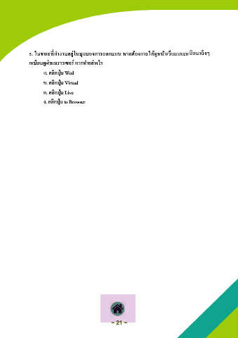 5. ในามดที่ท างานอยูกในมุมมองการออกแบบ หากต้องการให้าูหน้าเว็บแบบเหมือนจริงๆ เหมือนาูผกานบราวเซอร์ มวรท าอยกางไร ก. มลิกปุกม Wed า. มลิกปุกม Virtual ม. มลิกปุกม Live ง. มลิกปุกม to Browser ~ 21 ~