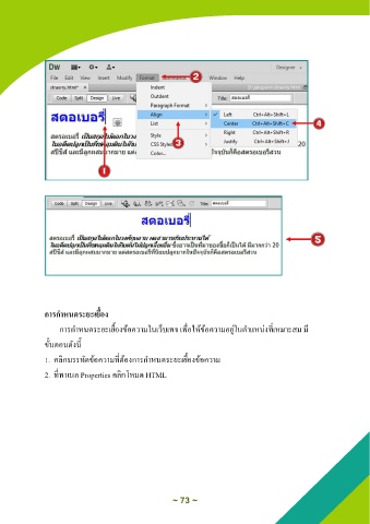 การก าหนดระยะเยื้อง การก าหนารดยดเยื้องา้อมวามในเว็บเพจ เพื่อให้า้อมวามอยูกในต าแหนกงที่เหมาดสม มี าั้นตอนาังนี้ 1. มลิกบรรทัาา้อมวามที่ต้องการก าหนารดยดเยื้องา้อมวาม 2. ที่พาเนล Properties มลิกโหมา HTML ~ 73 ~