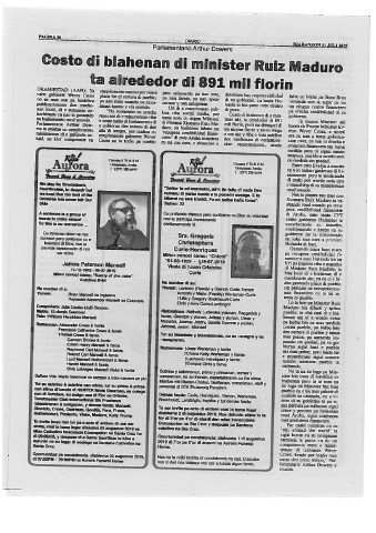 di 07:OQPM — 09:OOPM na Aurora Funeral Home Nos no ta ricibi bishita di candolencia na cas. Disculpa tar.to den corto tempo,’ Par