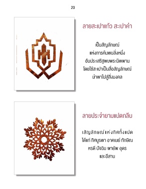 20 ลายสะเปาแก้ว สะเปาคำา เป็นสัญลักษณ์ แห่งการค้นพบสิ่งหนึ่ง อันประเสริฐพบพระนิพพาน โดยใช้สะเปาเป็นสื่อสัญลักษณ์ นำาพาไปสู่สิ่งมงคล ลายประจำายามแปดกลีบ เสัญลักษณ์แห่งทิศทั้งแปด ได้แก่ ทิศบูรพา อาคเนย์ ทักษิณ หรดี ปัจฉิม พายัพ อุดร และอีสาน