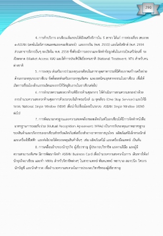4. การค้าบริการ อาเซียนเห็นชอบให้เปิดเสรีบริการใน 5 สาขา ได้แก่ การท่องเที่ยว สขภาพ
