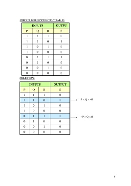 CIRCUIT FOR INPUT/OUTPUT TABLE: INPUTS OUTPU P Q R T S 1 1 1 0 1 1 0 1 1 0 1 0 1 0 0 0 0 1 1 1 0 1 0 0 0 0 1 0 0 0 0 0 SOLUTION: INPUTS OUTPUT P Q R S 1 1 1 0 1 1 0 1 P Q ~R 1 0 1 0 1 0 0 0 0 1 1 1 ~P Q R 0 1 0 0 0 0 1 0 0 0 0 0 6