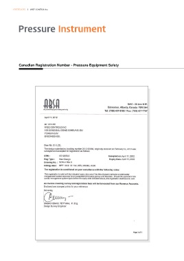 CERTIFICATES l WISE CONTROL.Inc. Pressure Instrument Canadian Registration Number - Pressure Equipment Safety
