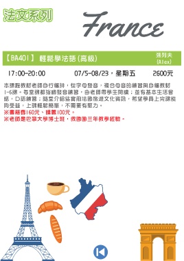法文系列 法文系列 法文系列 【BA401】 張列夫 輕鬆學法語(高級) (Alex) 17:00-20:00 07/5-08/23,星期五 2600元 本課程教材老師自行編排,從字母發音,複合母音的練習與自編教材 1-6課。每堂課都強調發音練習,由老師帶學生閱讀;並有基本生活會 話,口語練習;隨堂介紹些實用法國旅遊文化資訊,希望學員上完課能 夠受益,上課輕鬆簡單,不需要有壓力。 ※書籍費160元、講義100元。 ※老師是巴黎大學博士班,救國團三年教學經驗。