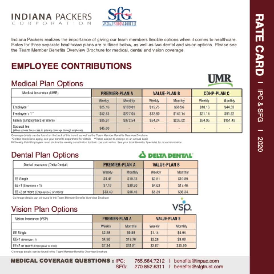 Indiana Packers realizes the importance of giving our team members flexible options when it comes to healthcare. Rates for three separate healthcare plans are outlined below, as well as two dental and vision options. Please see the Team Member Benefits Overview Brochure for medical, dental and vision coverage.