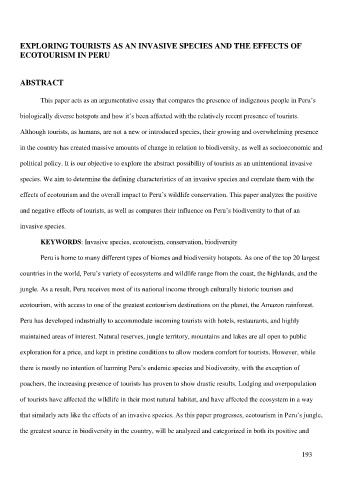 and negative effects of tourists, as well as compares their influence on Peru’s biodiversity to that of an