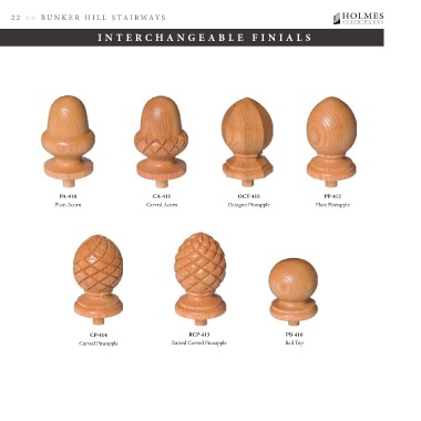 22 >> B UNKER HILL S T AIR WAY S HOLMES INTER CH AN GEAB LE FINI ALS PA-410 CA-411 OCT-415 PP-412 Plain Acorn Carved Acorn Octagon Pineapple Plain Pineapple CP-414 RCP-413 PB-416 Carved Pineapple Raised Carved Pineapple Ball Top